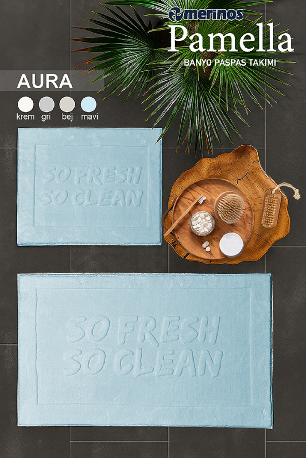 Merinos banyo paspası, Pamella banyo paspası, Aura mavi banyo paspası, 2'li banyo paspas takımı, kaymaz banyo paspası, mavi banyo paspası, uygun fiyatlı banyo paspası, kaliteli banyo paspası, Merinos paspas, banyo dekorasyon, modern banyo paspası, desenli banyo paspası