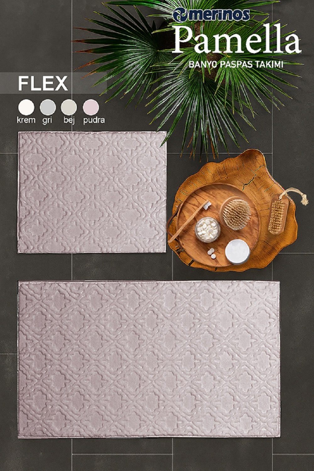 Merinos Pamella 2'li Banyo Paspas Takımı Flex Pudra, banyo dekorasyonunuzu tamamlayacak, konforunuzu artıracak ve güvenliğinizi sağlayacak ideal bir seçimdir. Kaymaz tabanı, kolay temizlenebilir yapısı ve şık tasarımı ile banyonuzun vazgeçilmezi olacak.